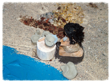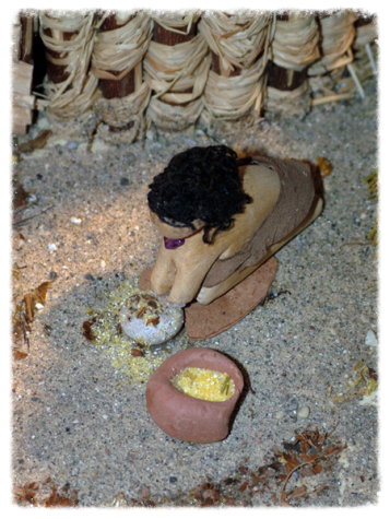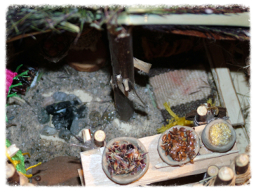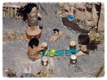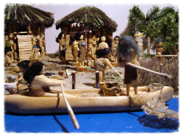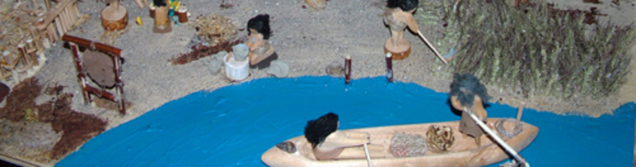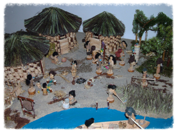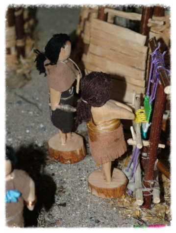 Ricostruzione di un villaggio Neolitico con vari personaggi legati alle attività dell'epoca.